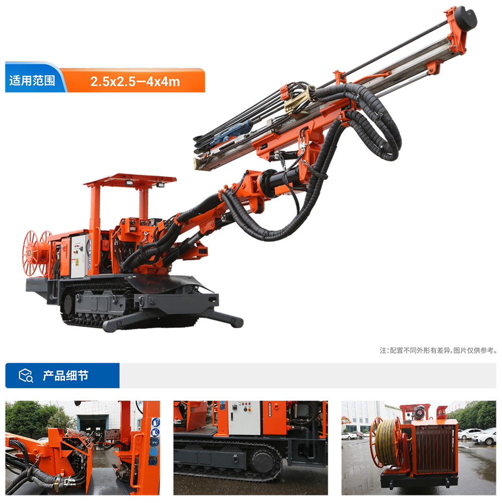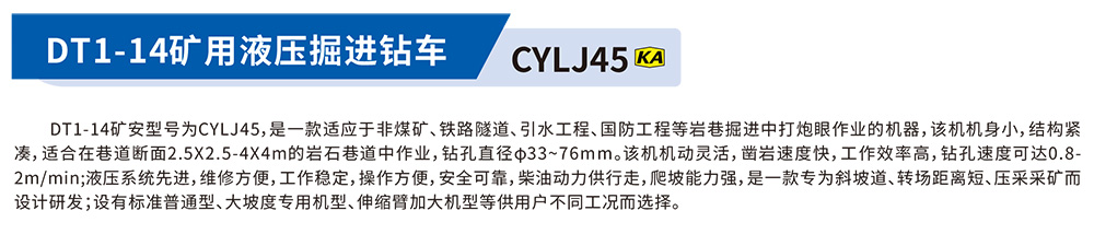 DT1-14矿安型号为CYLJ45,是一款适应于非煤矿、铁路隧道、引水工程、国防工程等岩巷掘进中打炮眼作业的机器,该机机身小,结构紧凑,适合在巷道断面2.5X2.5-4X4m的岩石巷道中作业,钻孔直径φ33~76mm。该机机动灵活,凿岩速度快,工作效率高,钻孔速度可达0.8.2m/min;液压系统先进,维修方便,工作稳定,操作方便,安全可靠,柴油动力供行走,爬坡能力强,是一款专为斜坡道、转场距离短、压采采矿而设计研发:设有标准普通型、大坡度专用机型、伸缩臂加大机型等供用户不同工况而选择。