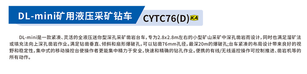 DL-mini是一款紧凑、灵活的全液压迷你型深孔采矿凿岩台车,专为2.8x2.8m左右的小型矿山采矿中深孔凿岩而设计,同时也满足溜矿法或填充法向上深孔凿岩作业。满足钻凿垂直、倾斜和扇形爆破孔,可以钻凿76mm孔径,最深20m的爆破孔;台车紧凑的布局设计带来良好的视野和稳定性,集中式的移动操控台使操作者更能集中精力于安全,快速和精确的钻孔作业。便携的有线/无线遥控操作可控制推进、凿岩机等的所有动作。