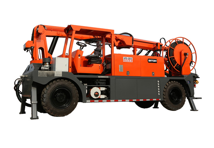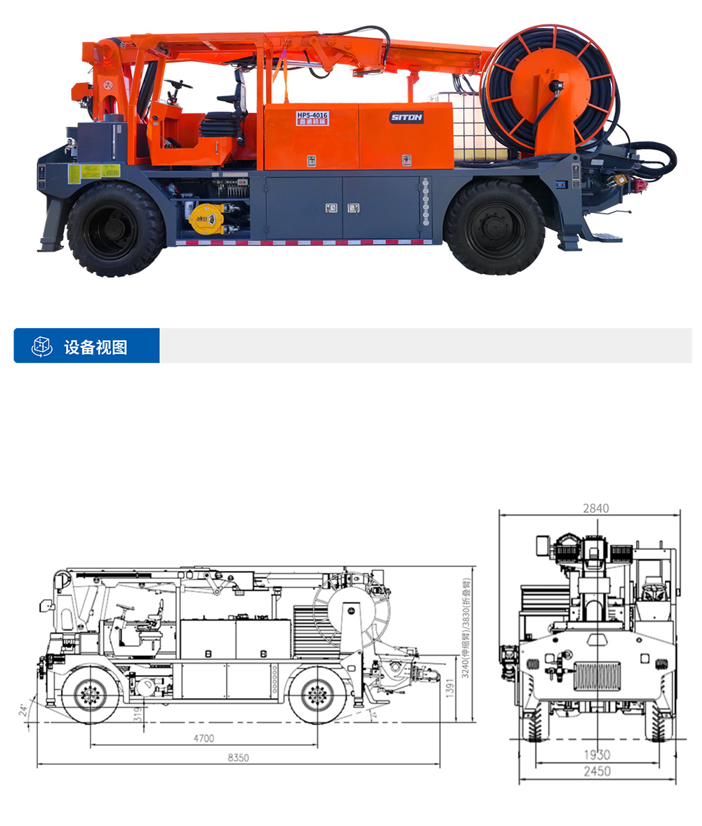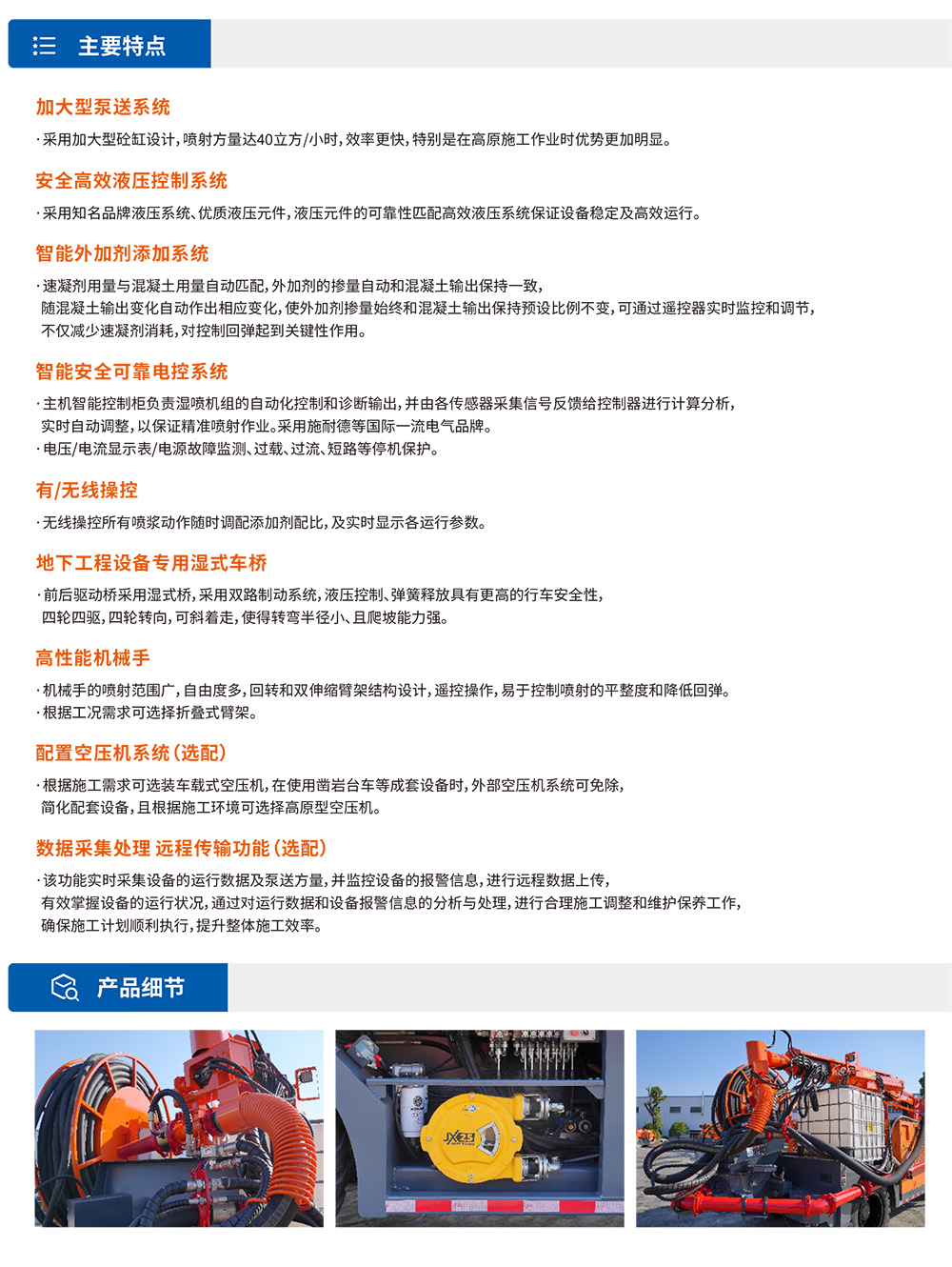 HP5-4016⼯程桥式湿喷台⻋(⼤⽅量)可选配⼤型空压机,四轮四转向,湿式驱动桥,极⼤地改善了隧道内部混凝⼟喷射施⼯⼈员的⼯作环境,提⾼了施⼯效率,减少了混凝⼟消耗量,切实保障施⼯质量,双动⼒⼯作系统,更低碳排放,更切合环保理念。是⽔利⽔电、铁路、公路等隧道施⼯的更佳选择。HP5湿喷台⻋⼀次性平⾏作业⼯作范围宽26mx⾼15m巷道,每⼩时可喷40m³,⾏⾛在20°坡度内、可喷顶邦、侧邦、底板、掌⼦⾯任意位置⽆死⻆喷射;该机作业机构采⽤全液压驱动,柴油动⼒⾏⾛,⾃动掺量速凝剂精度⾼。
