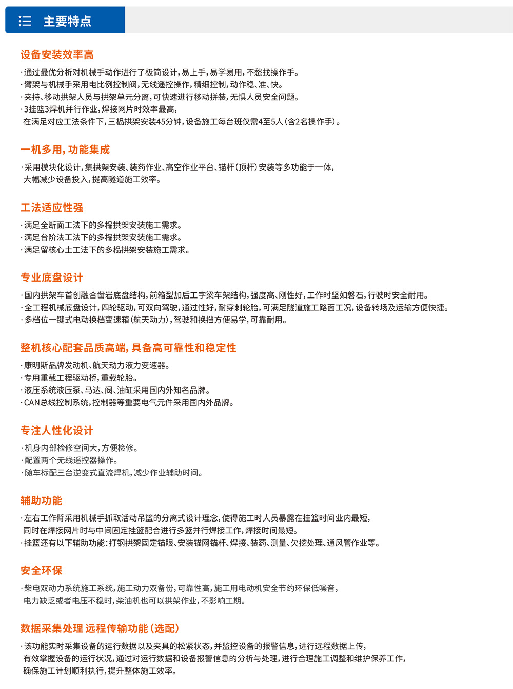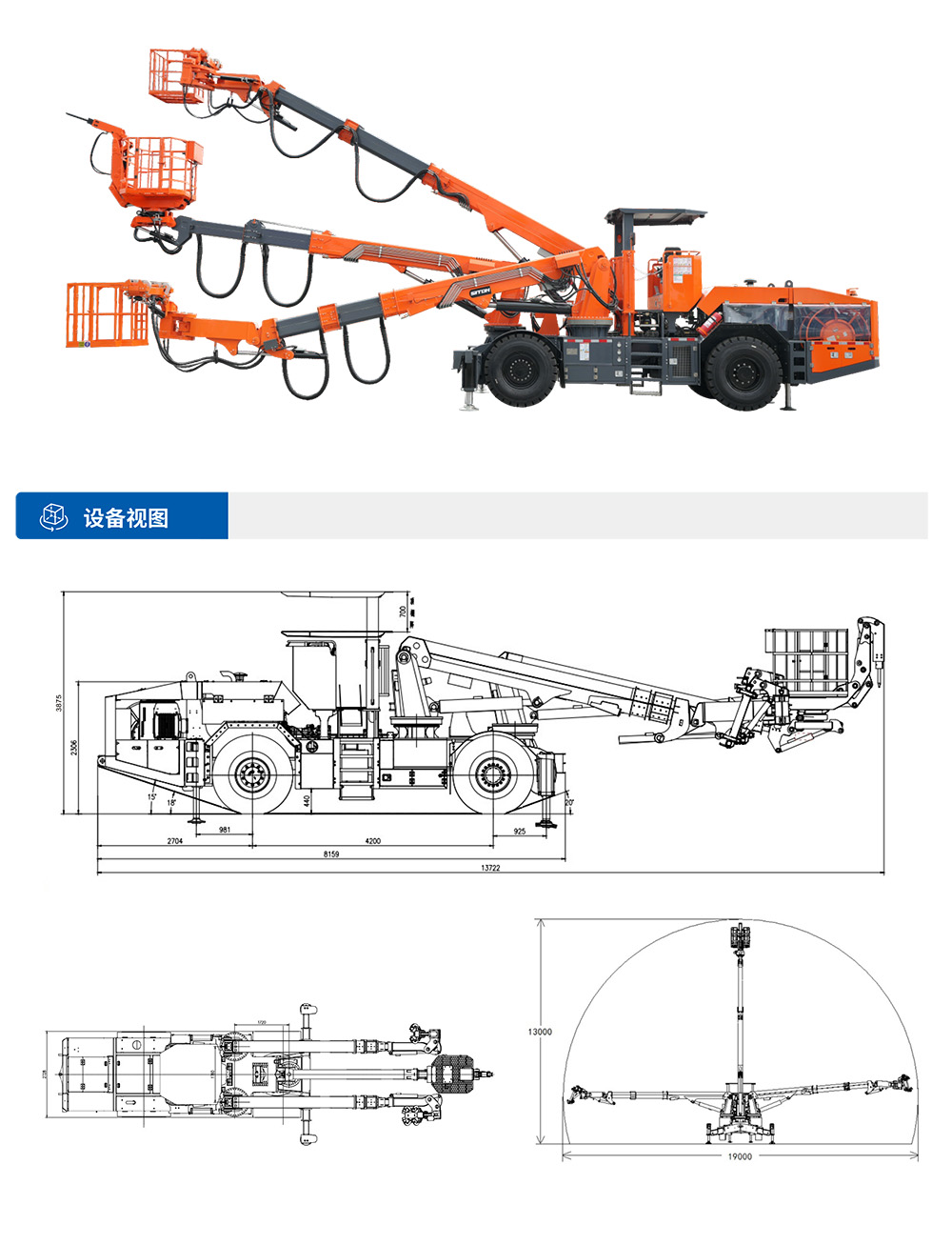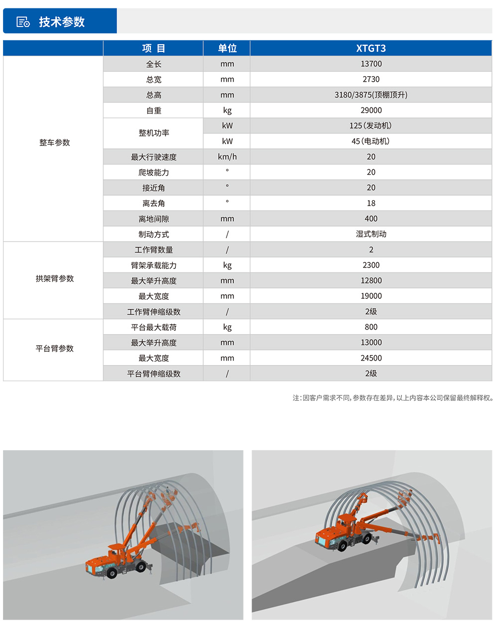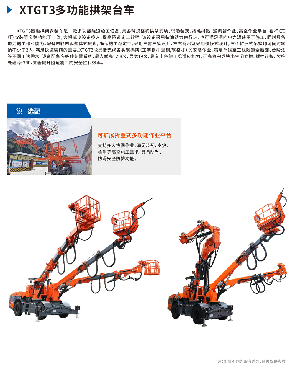 XTGT3隧道拱架安装⻋是⼀款多功能隧道施⼯设备,集各种规格钢拱架安装、辅助装药、撬⽑排险、通⻛管作业、⾼空作业平台、锚杆(顶杆)安装等多种功能于⼀体,⼤幅减少设备投⼊,提⾼隧道施⼯效率。该设备采⽤柴油动⼒供⾏⾛,也可满⾜洞内电⼒短缺⽤于施⼯,同时具备电⼒施⼯作业能⼒。配备四轮四驱整体式底盘,确保施⼯稳定性。采⽤三臂三篮设计,左右臂吊篮采⽤快换式设计,三个扩展式吊篮均可同时容纳不少于3⼈,满⾜快速装药的需要。XTGT3能灵活完成各类钢拱架(⼯字钢/H型钢/钢格栅)的安装作业,满⾜单线⾄三线隧道全断⾯、台阶法等不同⼯法需求。设备配备多级伸缩臂系统,最⼤举⾼12.8⽶,展宽19⽶,具有出⾊的⼯况适应能⼒,可⾼效完成狭⼩空间⽴拱、螺栓连接、⽋挖处理等作业,显著提升隧道施⼯的安全性和效率。