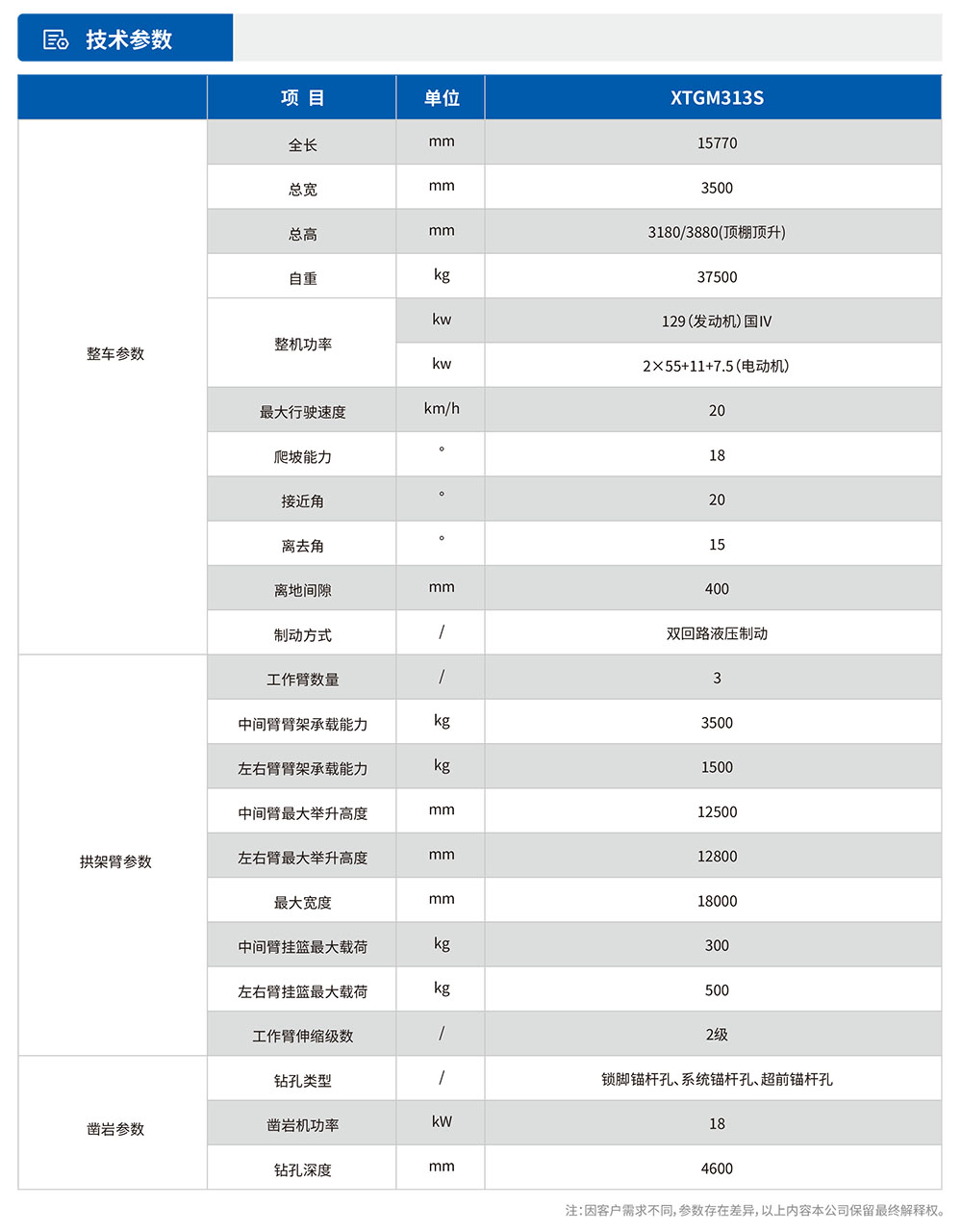 XTGM313S双凿岩拱锚台⻋融合拱架施⼯与锚杆施⼯为⼀体,能适应各种规格钢拱架安装、锚杆施⼯(锁脚、系统、超前锚杆)、辅助装药平台、辅助撬⽑和通⻛管作业等多功能、多⽤途的新型隧道施⼯机械。满⾜在铁路、公路隧道内安装单榀/多榀钢拱架(⼯字钢拱架、H型钢拱架、钢格栅拱架)的规范性及安全性要求;满⾜单洞单线、双线、三线单次开挖(全断⾯、台阶)⼀次性钢拱架安装距离要求。·三臂三篮三抓⼿结构,并⾏作业,效率⾼。·臂架与机械⼿全部采⽤电⽐例控制阀,⽆线遥控操作,动作稳、准、快。·3挂篮3焊机并⾏作业,焊接⽹⽚时效率最⾼。·⽴完拱架后,双凿岩即可同时进⾏锚杆作业,⽆需移⻋。·在满⾜对应⼯法条件下,三榀拱架安装45分钟,三榀锁脚锚杆孔施⼯20分钟,设备施⼯每台班仅需4⾄5⼈(含2名操作⼿)。