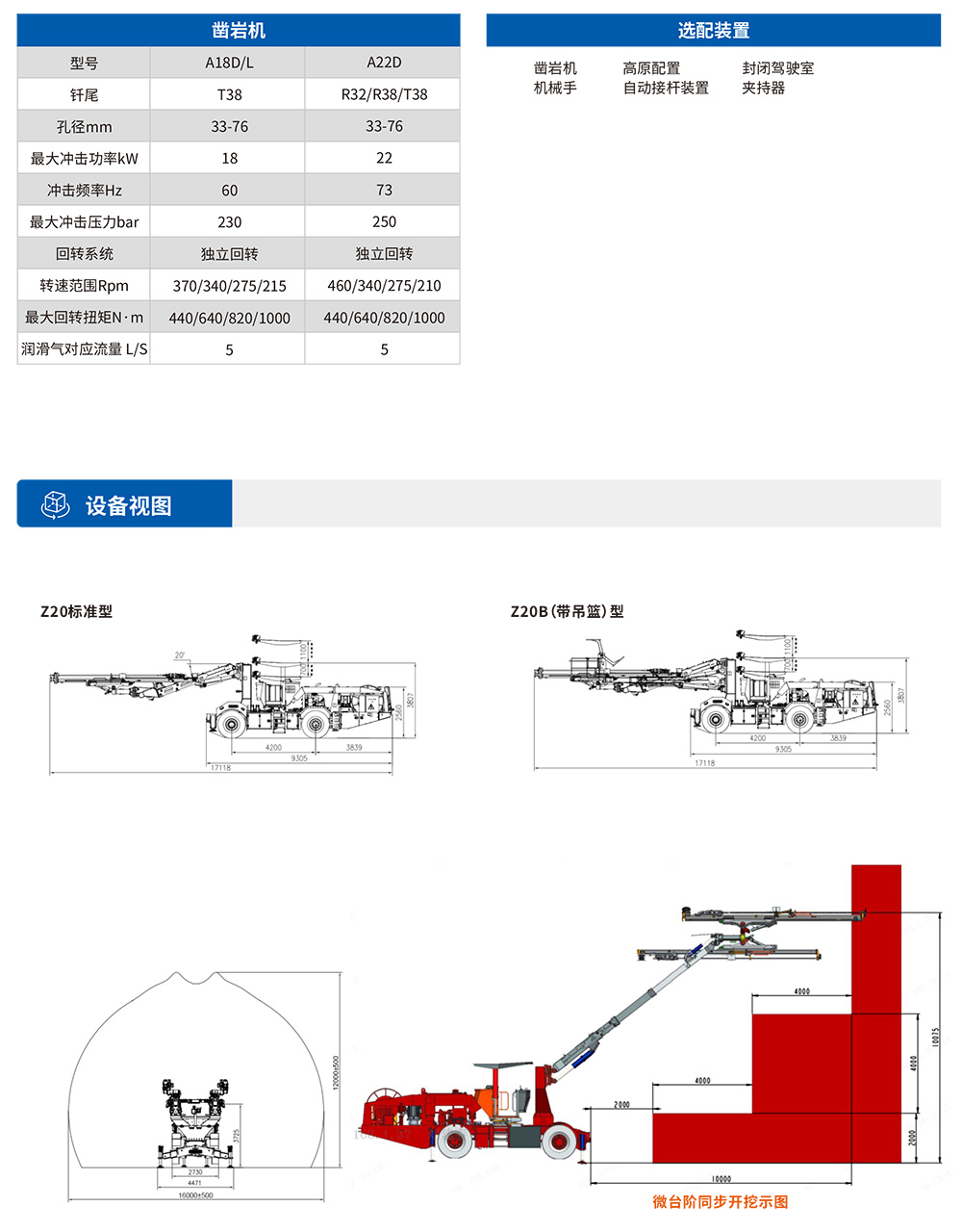 Z20系列全⼯法直臂凿岩台⻋是⼀款多功能数字直臂凿岩设备,专为多台阶同步、台阶法和全断⾯等全⼯法隧道开挖设计,突破传统设备单⼀⼯法限制,既能满⾜多台阶微步开挖⼜能满⾜全断⾯开挖的作业能⼒,实现⼀机适应多种施⼯需求。该系列提供Z20标准型、Z20B(带吊篮)和Z20E(智能型)三款型号,适⽤于⾼速⾼铁、⽔利⽔电及国防等中⼤型隧道⼯程,能⾼效完成炮孔、锚杆孔、⽀护导管及注浆孔等作业。采⽤全液压驱动和电液⽐例遥控系统,定位精准、凿岩速度快;配备柴油机四轮驱动⾏⾛系统,动⼒强劲,转场灵活稳定。整机结构紧凑、重⼼低,在提升施⼯安全性和效率的同时显著降低劳动强度。