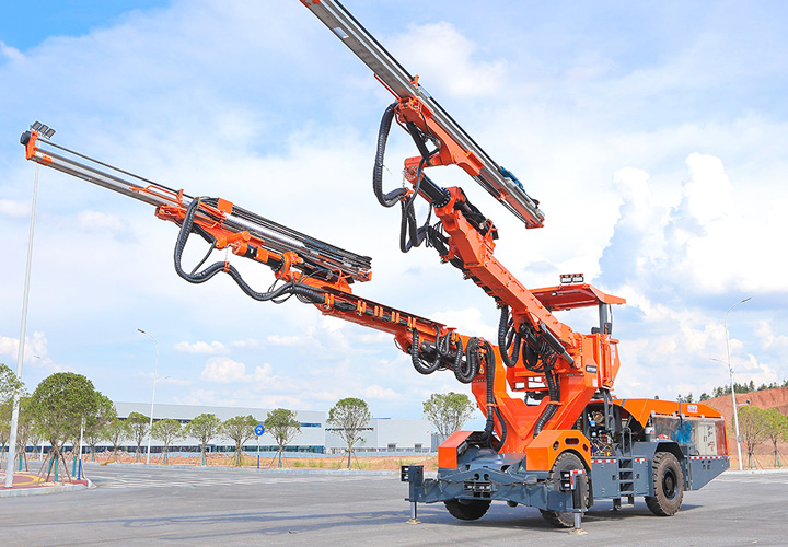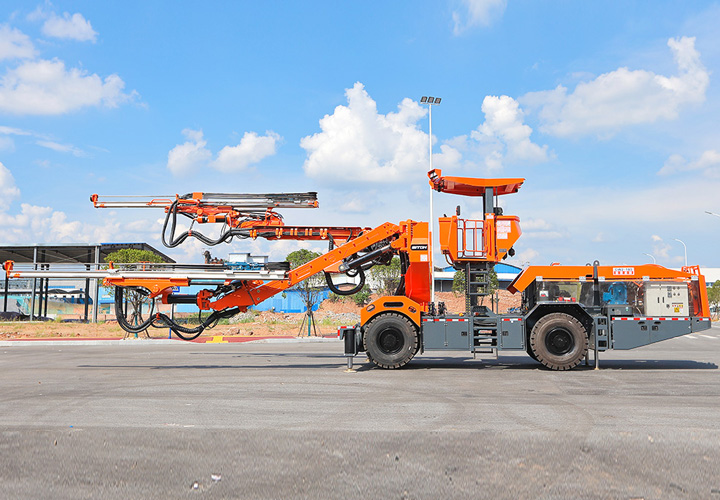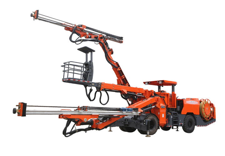 DW2-180鹰式臂全工序双臂(液压)凿岩台车为多台阶同步及全断面开挖而设计的一款满足全工法开挖施工凿岩设备,为满足多台阶同步开挖而设计研发。采用加长型鹰式钻臂设计解决了传统凿岩台车因一条隧道的开挖涉及多种工法而不能同时满足所有工法施工需求的缺陷。实现多台阶同步开挖、全断面开挖的问题,能满足导洞小巷道的开挖,使设备适应开挖工法及工况更广泛,采用两套钻臂独立液压系统控制互不干涉,钻臂可伸缩覆盖面积广,设有一套高空服务吊篮可为装药、排险、挂网等辅助工作提供升降平台。为高速高铁、水利水电工程、以及国防等中大型隧道掘进钻孔作业而研发制造的凿岩装备,满足凿岩掘进需要的各种炮孔、锚杆孔、小导管支护、注浆孔等,该机工作时采用全液压驱动,电液比例阀控系统控制钻臂凿岩,动作柔顺定位迅速、凿岩速度快,柴油机供行走,四轮四驱、转场灵活,整机结构布置紧凑、重心低、机动灵活、系统稳定,不仅提升安全保障和工作效率,也能降低劳动者的工作强度。