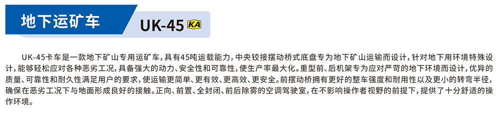 UK-45卡车是一款地下矿山专用运矿车,具有45吨运载能力,中央铰接摆动桥式底盘专为地下矿山运输而设计,针对地下用环境特殊设计,能够轻松应对各种恶劣工况,具备强大的动力、安全性和可靠性,使生产率最大化。重型前、后机架专为应对严苛的地下环境而设计,优异的质量、可靠性和耐久性满足用户的要求,使运输更简单、更有效、更高效、更安全。前摆动桥拥有更好的整车强度和耐用性以及更小的转弯半径,确保在恶劣工况下与地面形成良好的接触。正向、前置、全封闭、前后除雾的空调驾驶室,在不影响操作者视野的前提下,提供了十分舒适的操作环境。