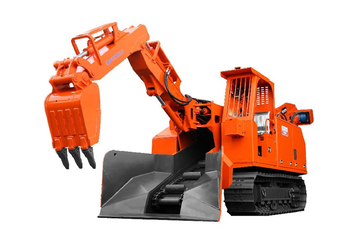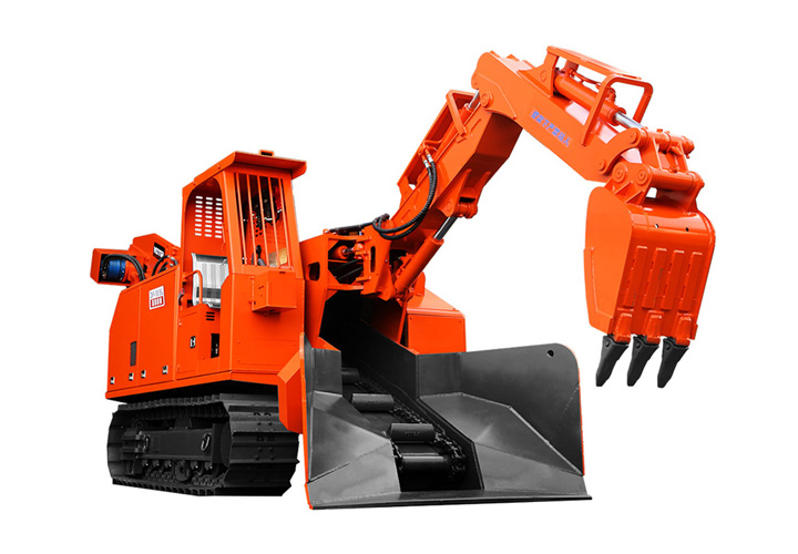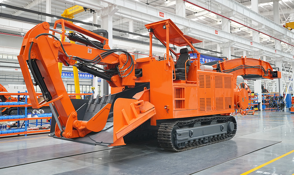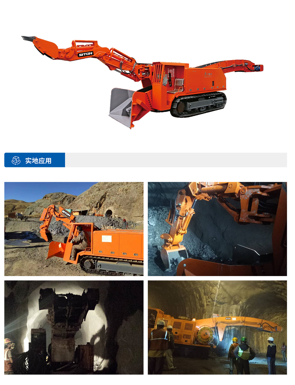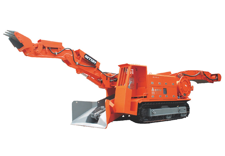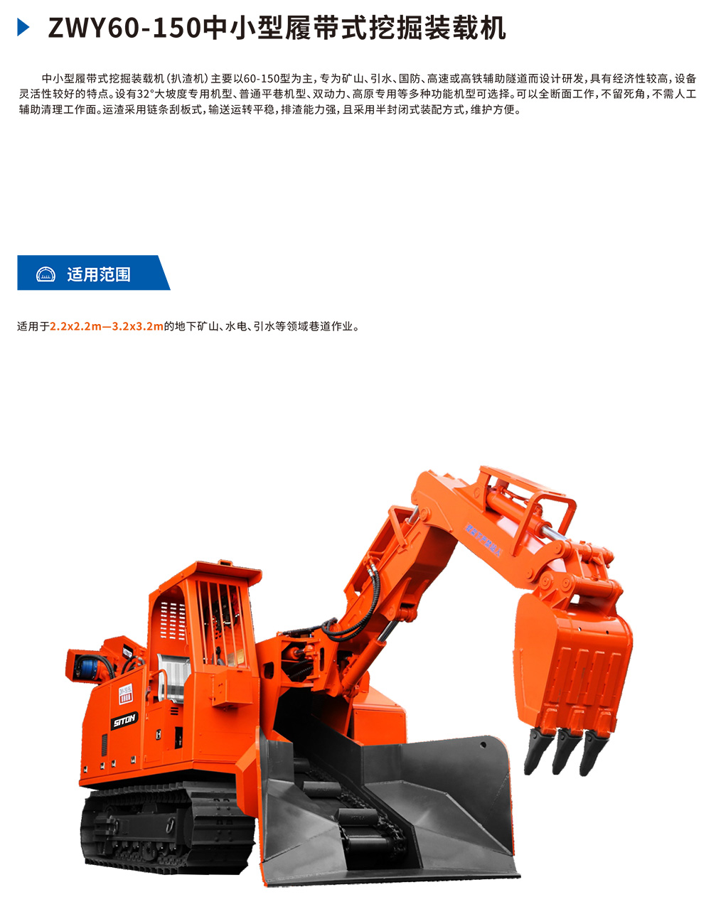 中⼩型履带式挖掘装载机(扒渣机)主要以60-150型为主,专为矿⼭、引⽔、国防、⾼速或⾼铁辅助隧道⽽设计研发,具有经济性较⾼,设备灵活性较好的特点。设有32°⼤坡度专⽤机型、普通平巷机型、双动⼒、⾼原专⽤等多种功能机型可选择。可以全断⾯⼯作,不留死⻆,不需⼈⼯辅助清理⼯作⾯。运渣采⽤链条刮板式,输送运转平稳,排渣能⼒强,且采⽤半封闭式装配⽅式,维护⽅便。
