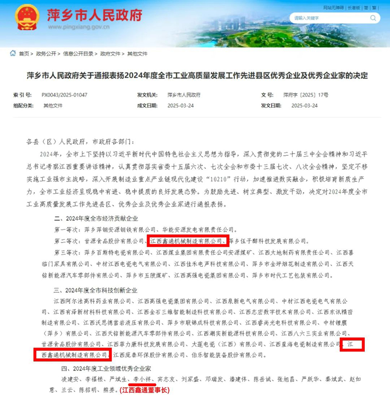 江西鑫通在通报表扬中三登荣誉榜,公司主体获得“2024年度全市经济贡献企业”和“2024年度全市科技创新企业”称号,公司董事长李小祥荣获全市“2024年度工业领域优秀企业家”称号。