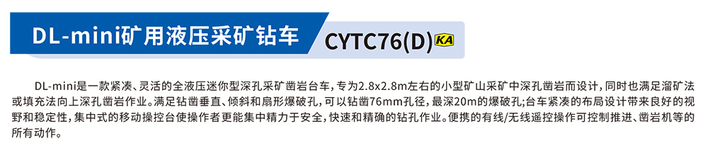 DL-mini是一款紧凑、灵活的全液压迷你型深孔采矿凿岩台车,专为2.8x2.8m左右的小型矿山采矿中深孔凿岩而设计,同时也满足溜矿法或填充法向上深孔凿岩作业。满足钻凿垂直、倾斜和扇形爆破孔,可以钻凿76mm孔径,最深20m的爆破孔;台车紧凑的布局设计带来良好的视野和稳定性,集中式的移动操控台使操作者更能集中精力于安全,快速和精确的钻孔作业。便携的有线/无线遥控操作可控制推进、凿岩机等的所有动作。