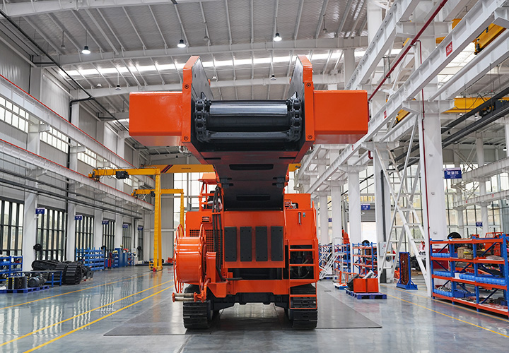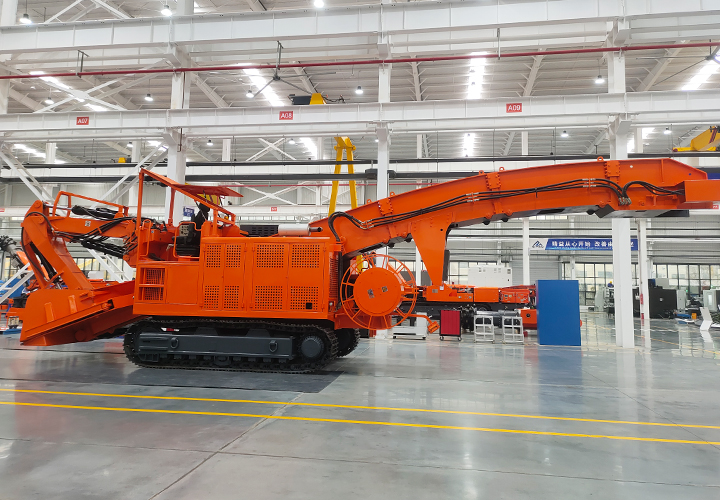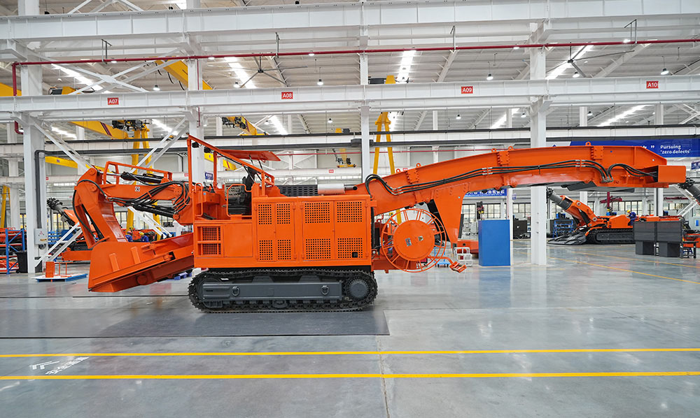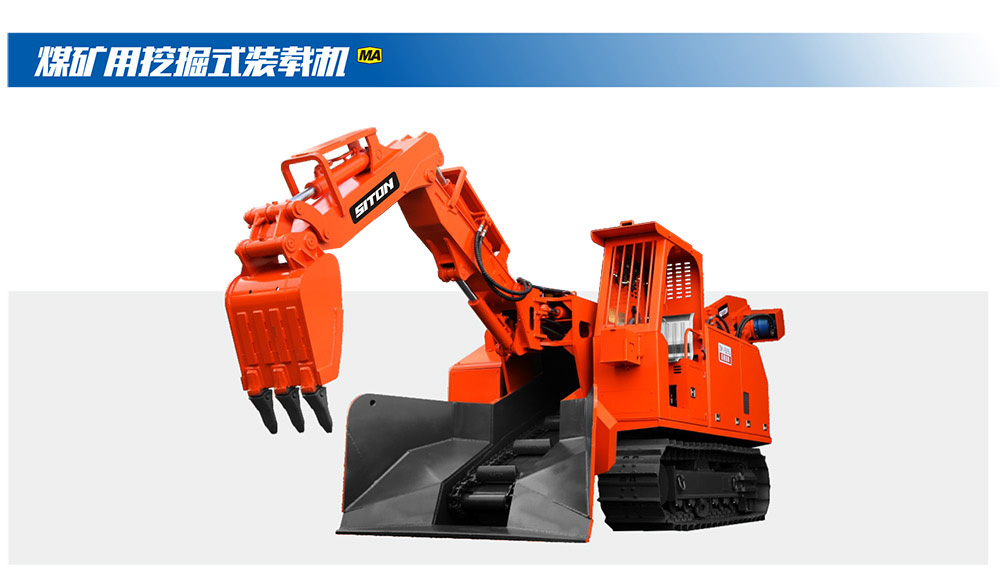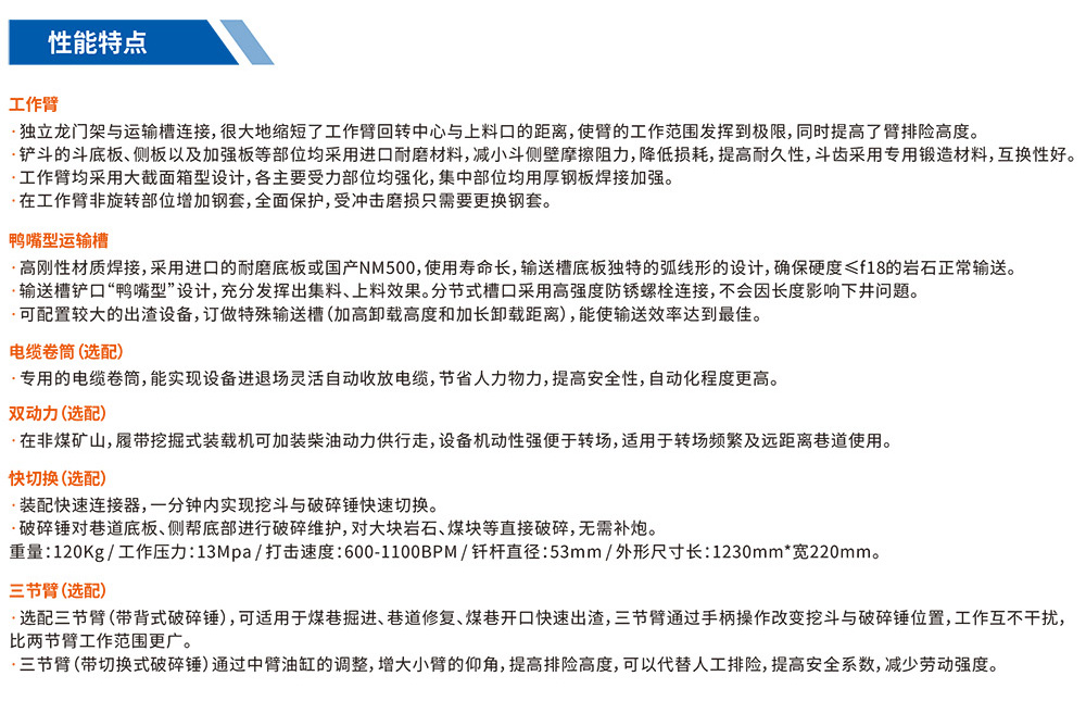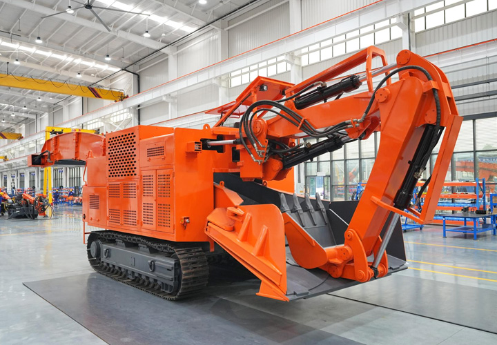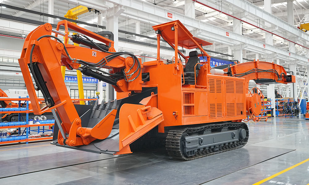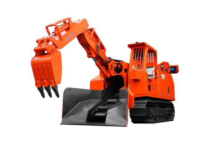 履带挖掘式装载机(扒渣机)是一种连续生产出渣设备,用于铁路、公路隧道及煤矿引水洞、国防洞窟掘进施工中装载作业。本机靠履带推进扒取岩石,通过反铲机构扒臂扒取远处的岩石进自身的刮板输送机,输送机从尾部将岩石卸入自卸汽车、梭式矿车、侧卸式矿车、皮带机等其它转载设备。