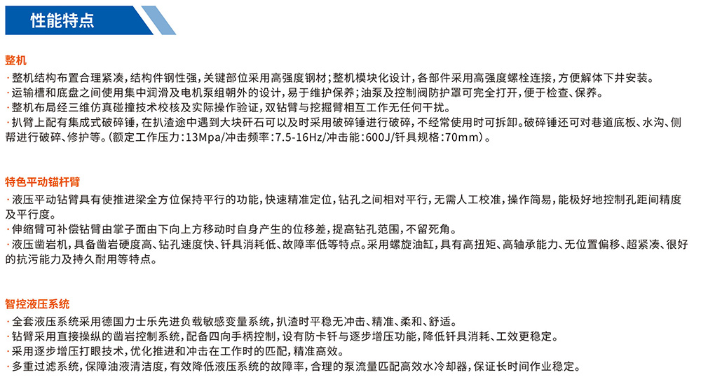 煤矿用岩巷钻装机组(简称“钻装机”)是一种集凿岩与装载两种功能于一体的高效连续作业钻装机组。主要用于煤矿、引水洞以及其它工程巷道中的掘进作业。提高了掘进速度,降低了工人的劳动强度,有效保障了掘进施工作业的安全性,很好的实现了岩巷快速掘进的机械化作业需求,同时解决了中小巷道多种设备错车问题。