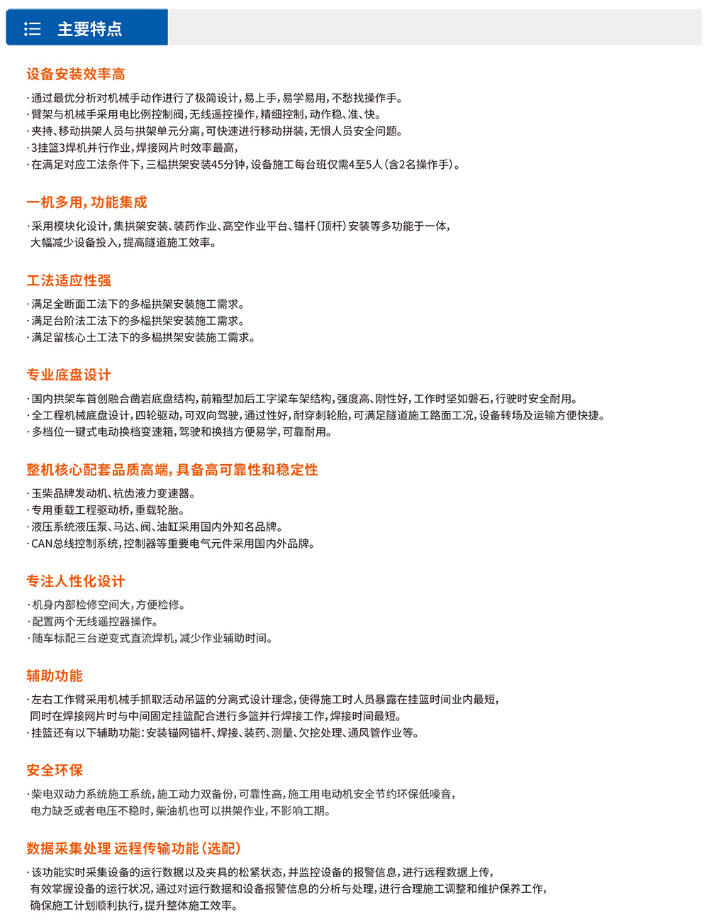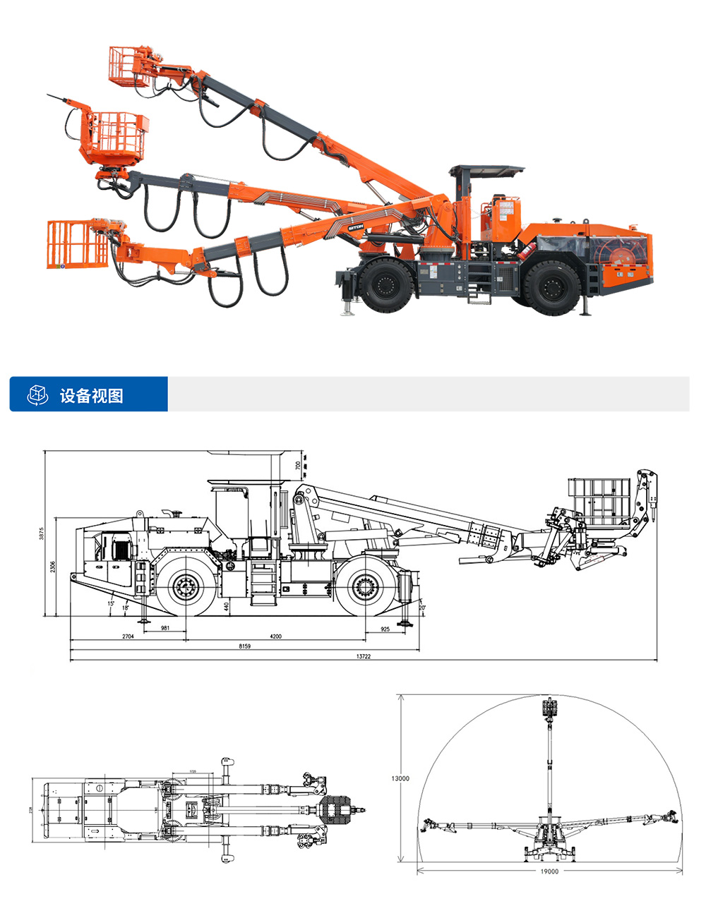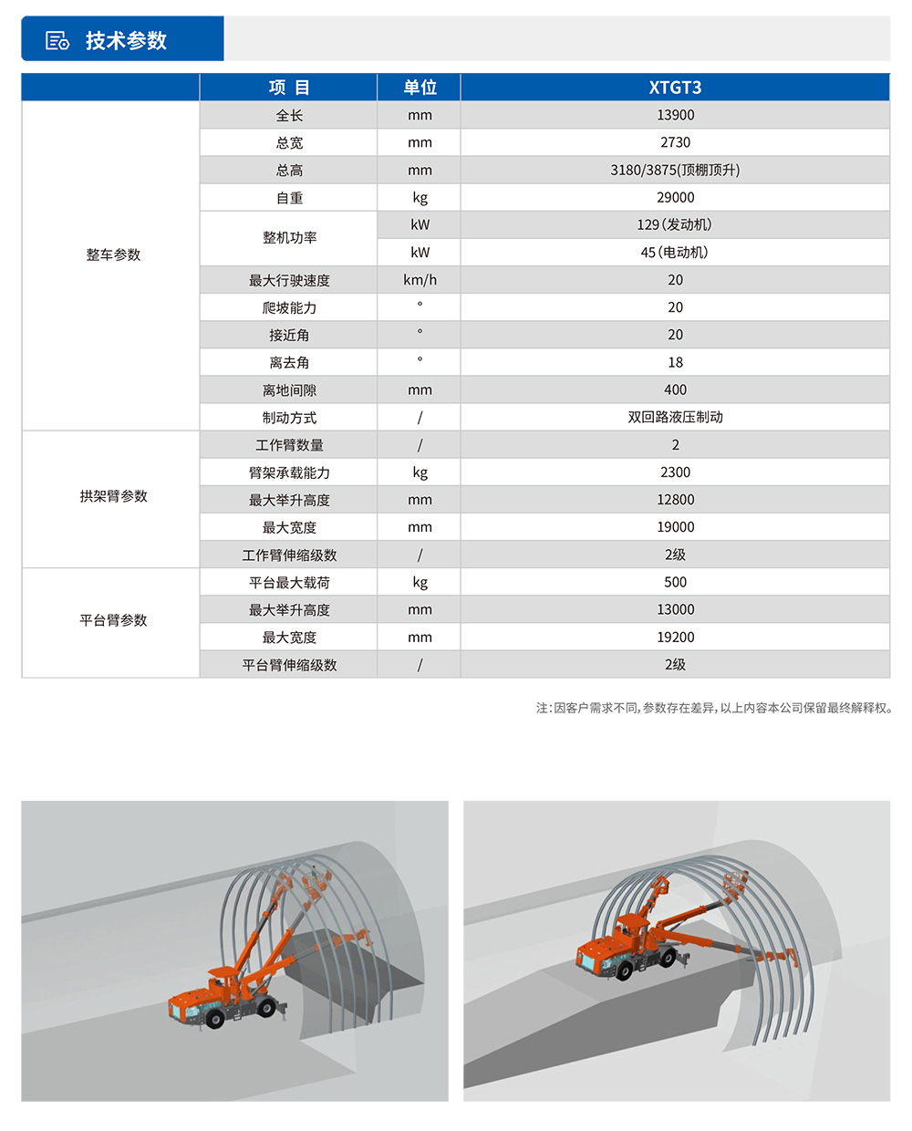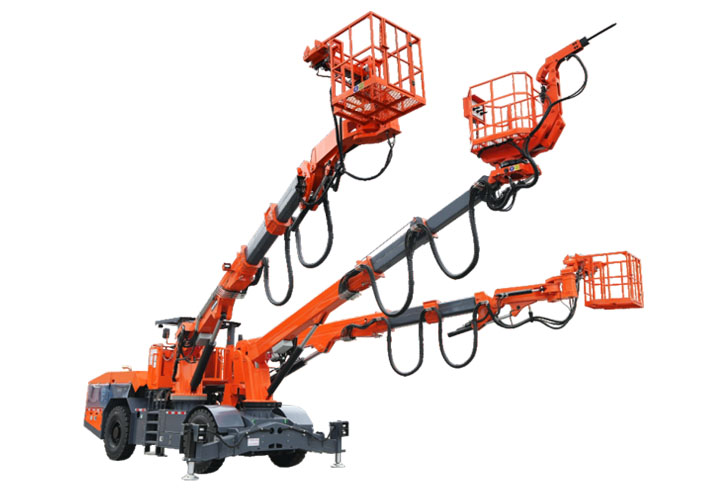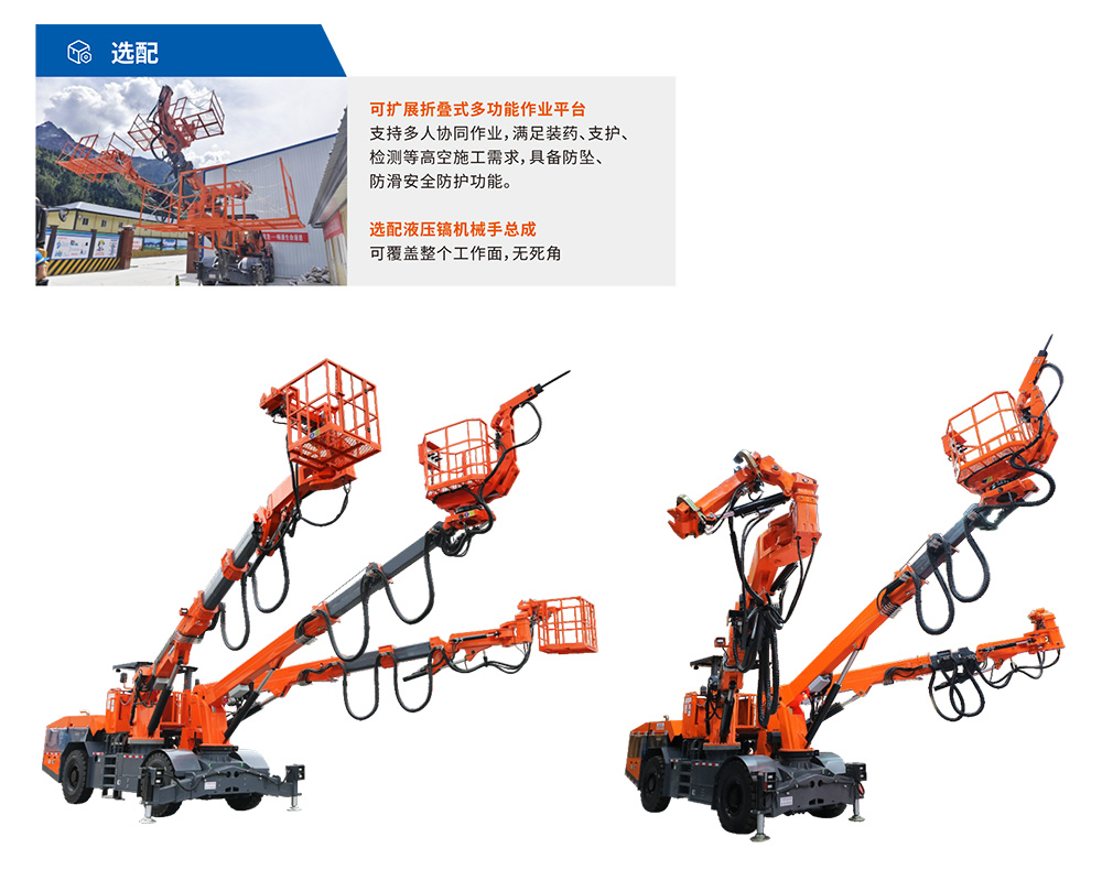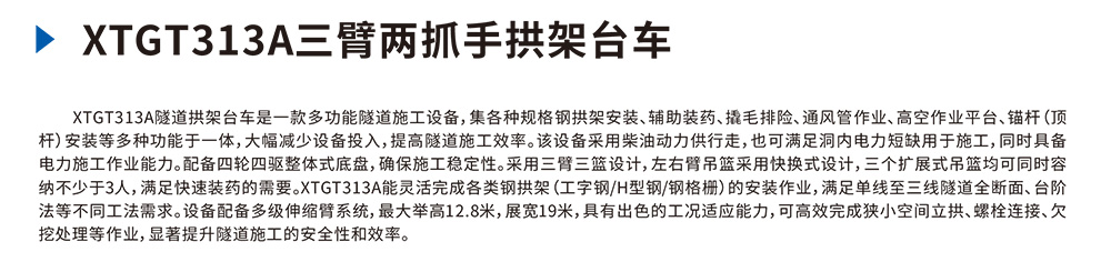 XTGT3隧道拱架安装⻋是⼀款多功能隧道施⼯设备,集各种规格钢拱架安装、辅助装药、撬⽑排险、通⻛管作业、⾼空作业平台、锚杆(顶杆)安装等多种功能于⼀体,⼤幅减少设备投⼊,提⾼隧道施⼯效率。该设备采⽤柴油动⼒供⾏⾛,也可满⾜洞内电⼒短缺⽤于施⼯,同时具备电⼒施⼯作业能⼒。配备四轮四驱整体式底盘,确保施⼯稳定性。采⽤三臂三篮设计,左右臂吊篮采⽤快换式设计,三个扩展式吊篮均可同时容纳不少于3⼈,满⾜快速装药的需要。XTGT3能灵活完成各类钢拱架(⼯字钢/H型钢/钢格栅)的安装作业,满⾜单线⾄三线隧道全断⾯、台阶法等不同⼯法需求。设备配备多级伸缩臂系统,最⼤举⾼12.8⽶,展宽19⽶,具有出⾊的⼯况适应能⼒,可⾼效完成狭⼩空间⽴拱、螺栓连接、⽋挖处理等作业,显著提升隧道施⼯的安全性和效率。