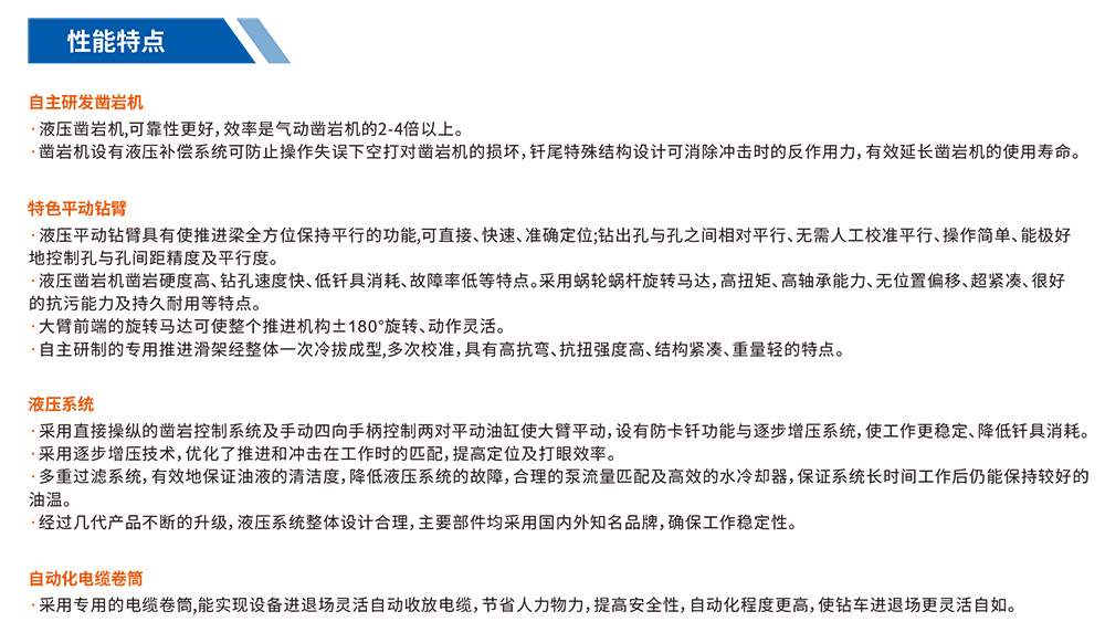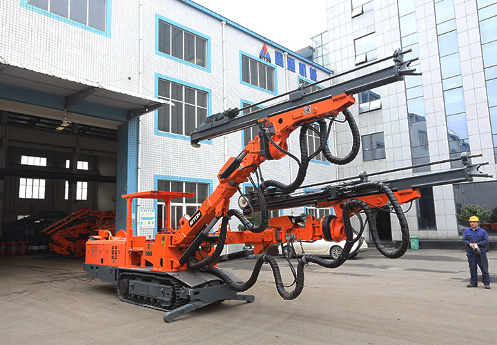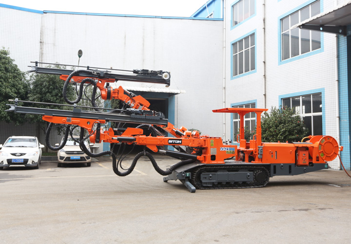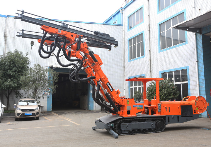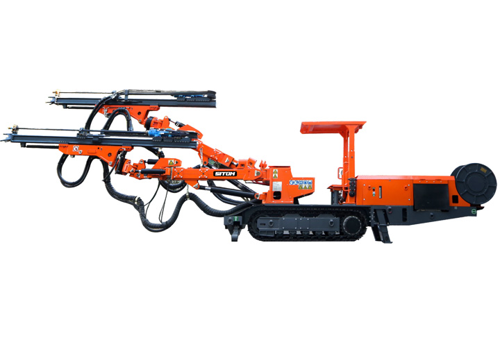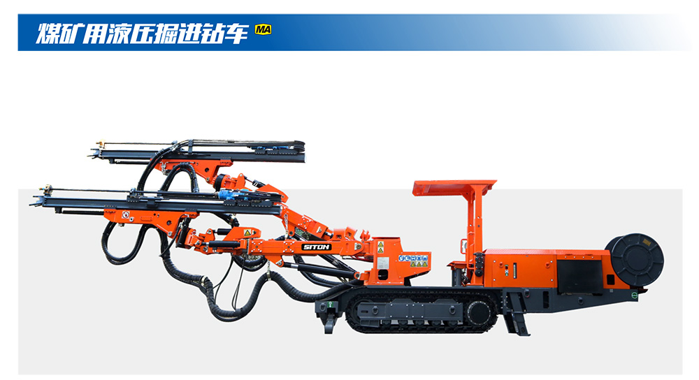 自主研发生产的履带式掘进钻车,设备用于煤矿、金属矿掘进等领域的巷道隧道掘进时所需爆破孔作业。工人可站在安全处远程操作机械手臂凿岩,代替人工手持风钻打孔作业,降低人工作业强度、提高工作效率及安全系数。该机型适用于断面(宽x高)3.0mx3.0m至7.2mx5.5m,爬坡≤14°,行走速度可达1.8km/h。工作机构采用全液压驱动,凿岩速度可达0.8-2m/min,采用全液压驱动,系统先进,操作便捷,凿岩速度快、机动灵活、爬坡能力强、检修方便、作业稳定、安全可靠。