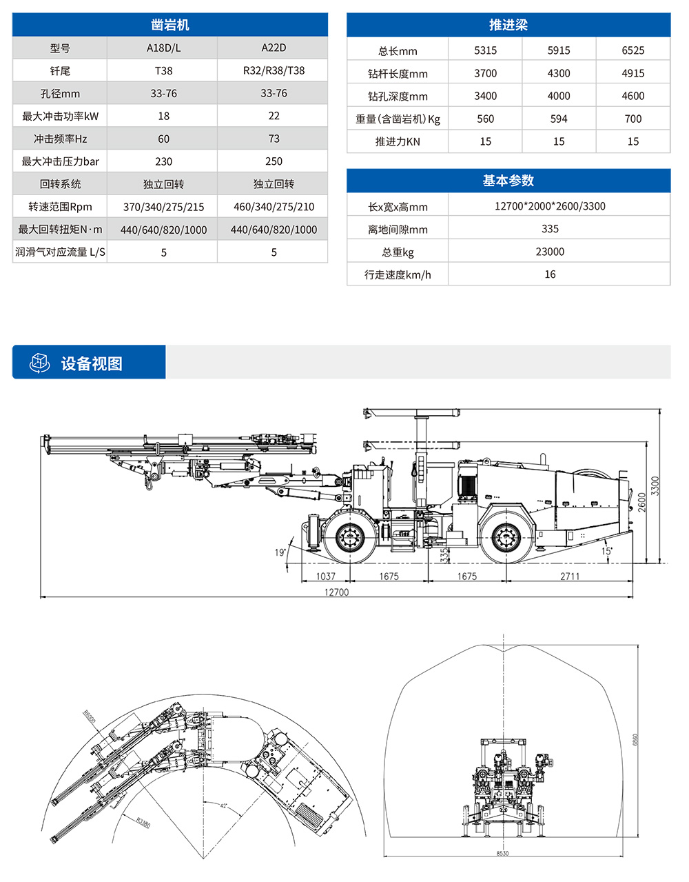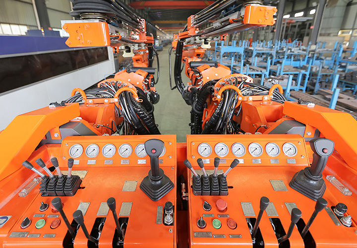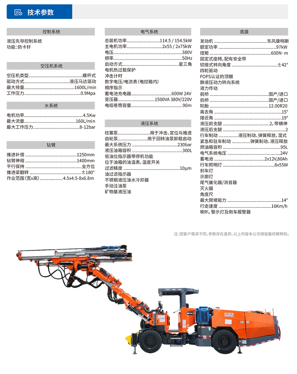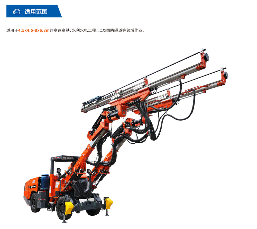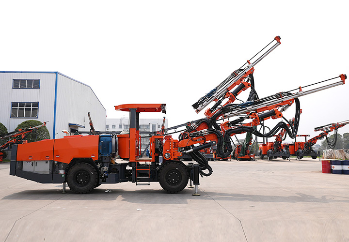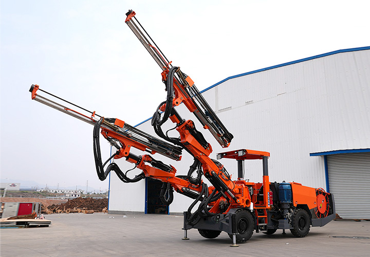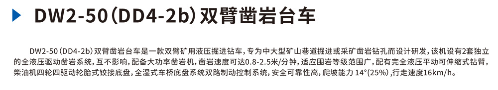 DW2-50(DD4-2b)双臂凿岩台⻋是⼀款双臂矿⽤液压掘进钻⻋,专为中⼤型矿⼭巷道掘进或采矿凿岩钻孔⽽设计研发,该机设有2套独⽴的全液压驱动凿岩系统,互不影响,配备⼤功率凿岩机,凿岩速度可达0.8-2.5⽶/分钟,适应围岩等级范围⼴,配有完全液压平动可伸缩式钻臂,柴油机四轮四驱动轮胎式饺接底盘,全湿式⻋桥底盘系统双路制动控制系统,安全可靠性⾼,爬坡能⼒14°(25%),⾏⾛速度16km/h。
