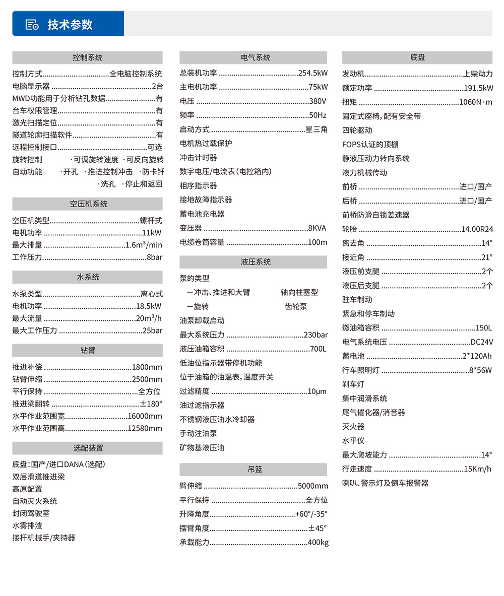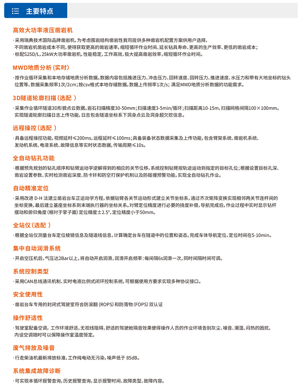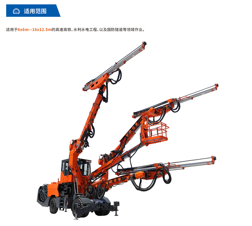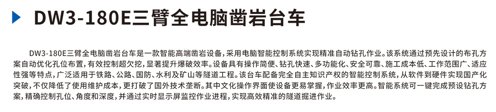 DW3-180E三臂电脑凿岩台车是,采用电脑智能控制系统掌控钻臂按预先设计好的布孔自动凿岩作业,最大限度减少隧道施工中的超、欠挖,并不断优化孔位布置,提高爆破效率。操作简单、钻孔速度快、多功能化、安全系数高、施工成本低、工作范围广等特性广泛适应于铁路、公路、国防、水利、矿山等隧道掘进钻孔作业中。从软件到硬件国产化,降低使用成本、维护成本、打破国外垄断;系统中文化使得操作简单、作业效率快、多功能化、降低施工成本。电脑自动化控制系统掌控钻臂按预先设计好布孔图有序一键完成自动钻孔,自动控制钻孔孔位、推进梁角度和孔深,同时显示器显示实时钻孔情况。