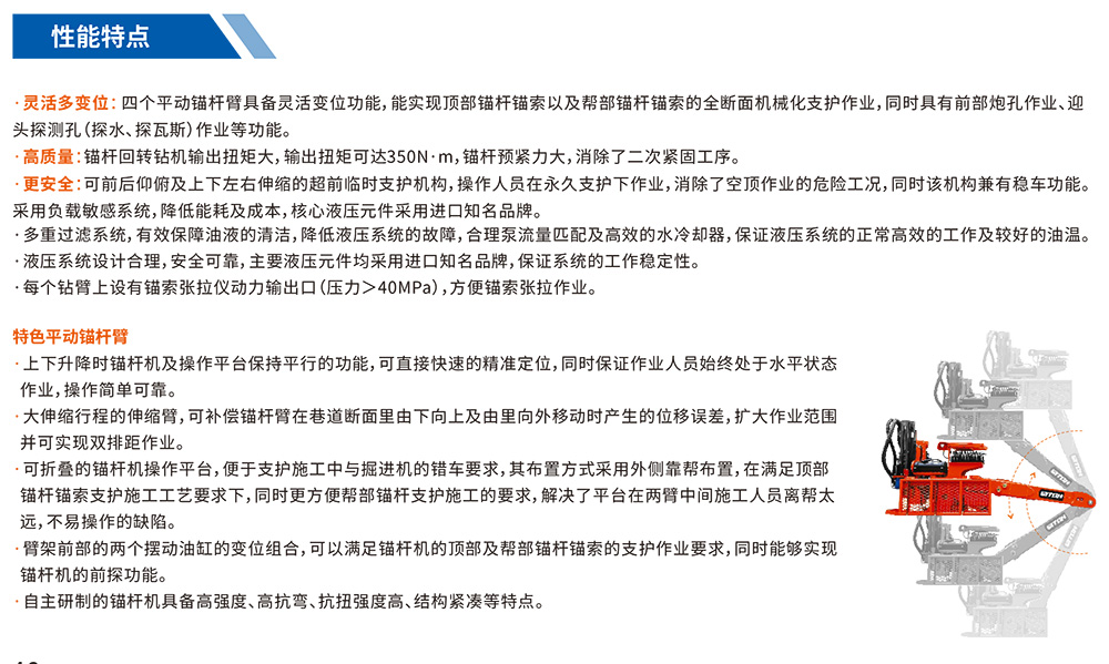 全波压四臀铺杆钻车是为掘进巷道支护施工而设计的专用设备,可与掘进机、连采机、据错机等掘进设备进行良好的交叉配套作业,是目前巷道支护先进技术的代表。全面实现巷道的顶部和帮部锚杆锚索支护作业等功能。