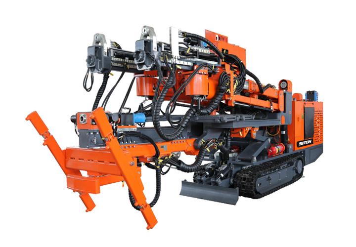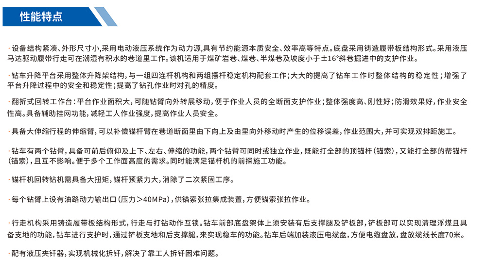 煤矿用液压错杆钻车是款新型巷道支护机械设备,是在两臂锚杆钻车基础上新增加长探功能,与两臂锚杆钻车共用一个波压系统。该机与掘进机、钻装机组配套使用,能快速完成巷道顶部和侧帮错杆馐索支护工作,实现作业平衡,提高机械化。且能实现超前探功能,方便施工瓦斯抽放孔、煤层注水孔、防突卸压孔、地质勘探孔等。
