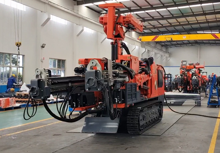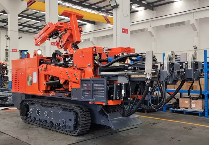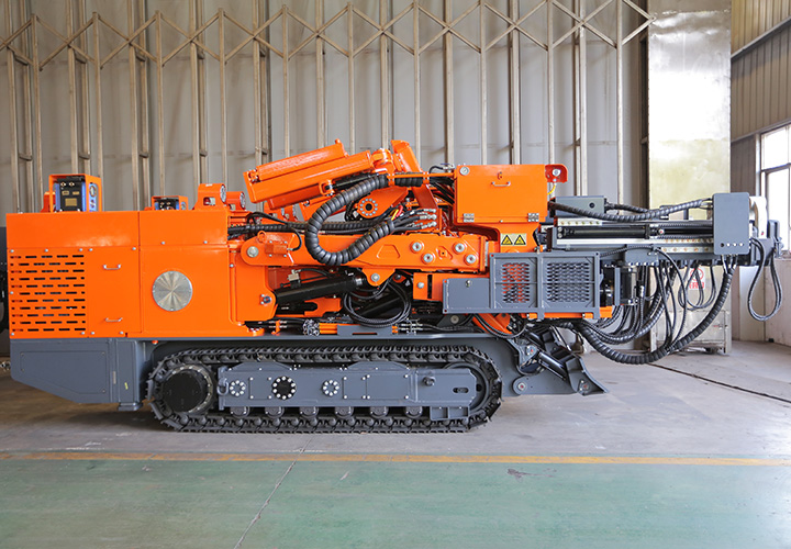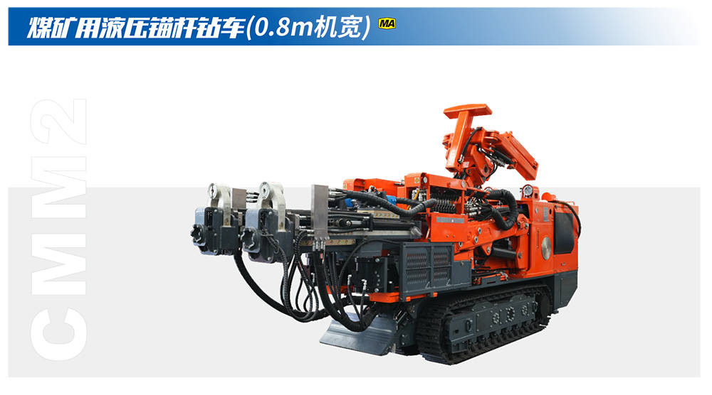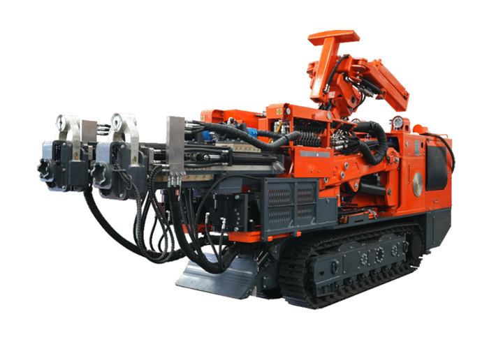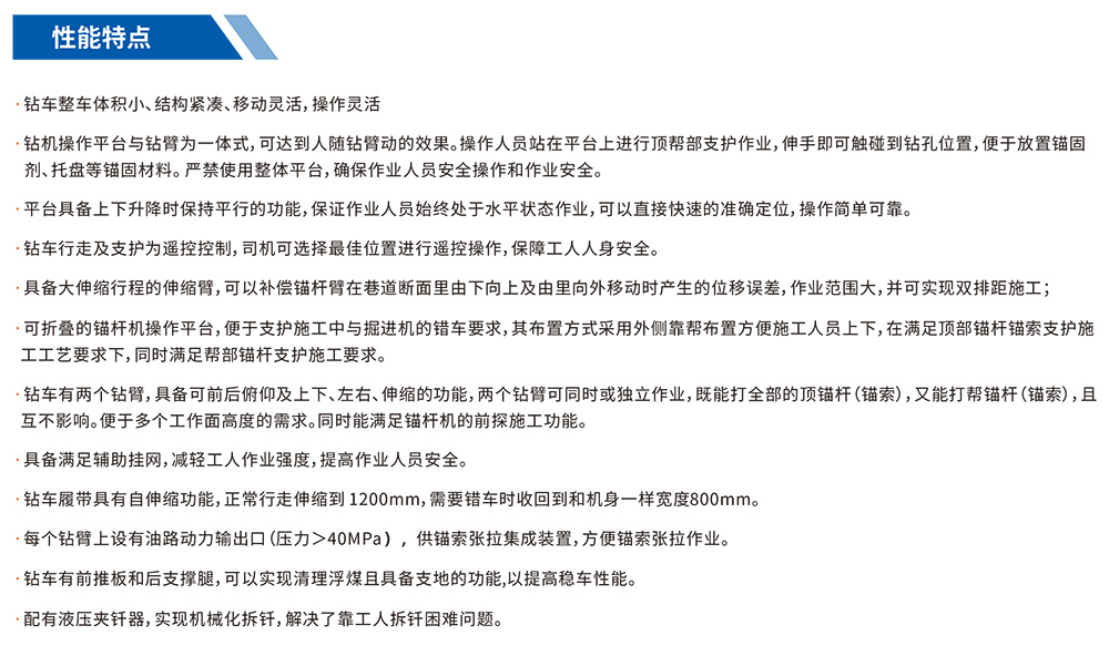 煤矿用液压锚杆钻车是款新型巷道支护机械设备,该机与据进机组配套使用,能快速完成支护工作,实现作业平衡,提高机械化。主要用于煤岩和半煤岩巷道工作面支护作业,能够同时实现巷道顶部和侧帮错杆错索支护,还具有煤层内钻炮孔及探测孔(探水、探瓦斯)等功能。设备结构紧凑、外形尺寸小,采用电动液压系统作为动力源,具有节约能源本质安金、效率高等特点。底盘采用履带结构形式,采用韩国斗山原装进口液压马达驱动履带行走,可在潮湿有积水的巷道里工作。该机适用于煤矿煤巷、半煤巷及坡度小于士15°斜巷掘进中的支护作业。