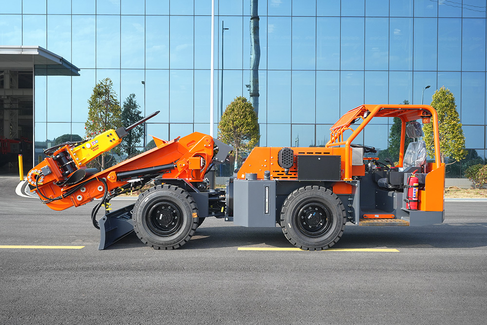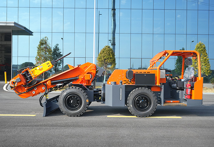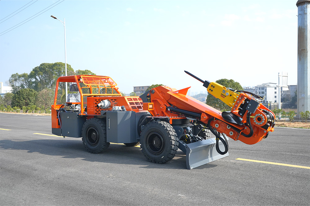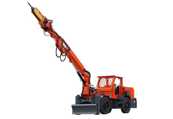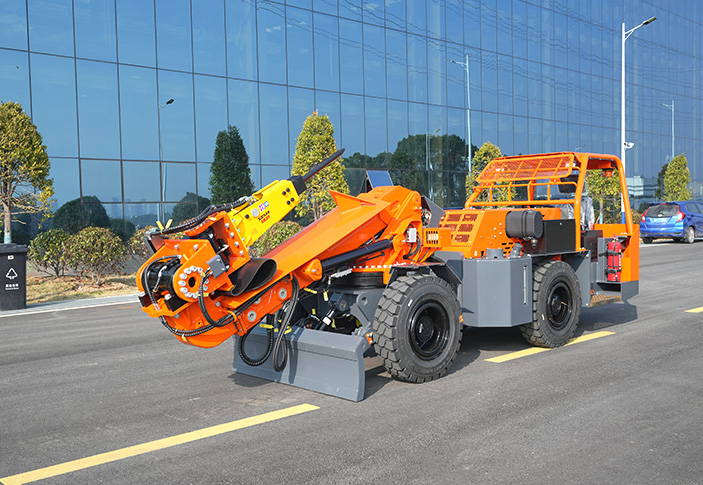 撬⽑台⻋是⼀款针对中⼩型巷道研发的撬⽑排险专⽤设备,全时四驱,四轮湿式制动,铰接式底盘转弯半径⼩,通⾏能⼒强。该设备⽤机械代替⼈⼯撬⽑作业,主要适⽤于地下矿⼭采掘⼯程及各种井下开挖⼯程隧道、撬洞等撬⽑作业和敲邦问顶⼯作,能快速有效的清除爆破作业后易冒落、垮塌、⽐较隐蔽的⼯作⾯顶板和两邦不稳固的岩⽯,防⽌冒顶⽚邦事故发⽣,确保作业现场⼈员以及设备安全,可以摸⾼6m-9m。