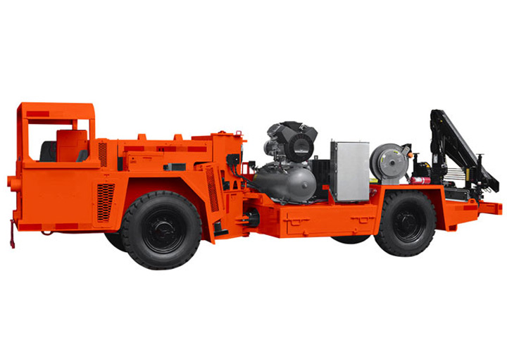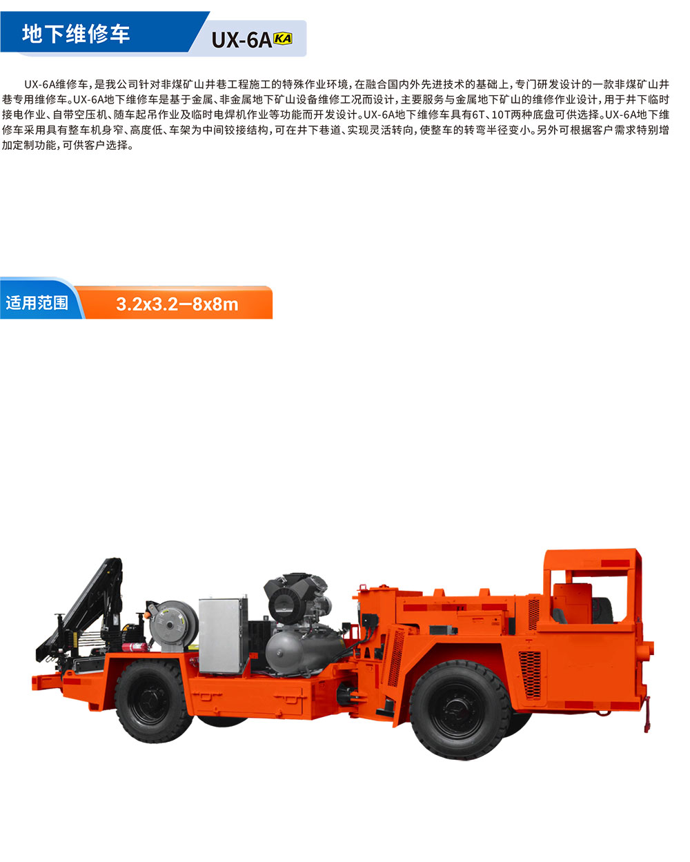 UX-6A维修车,是我公司针对非煤矿山井巷工程施工的特殊作业环境,在融合国内外先进技术的基础上,专门研发设计的一款非煤矿山井巷专用维修车。UX-6A地下维修车是基于金属、非金属地下矿山设备维修工况而设计,主要服务与金属地下矿山的维修作业设计,用于井下临时接电作业、自带空压机、随车起吊作业及临时电焊机作业等功能而开发设计。UX-6A地下维修车具有6T、10T两种底盘可供选择。UX-6A地下维修车采用具有整车机身窄、高度低、车架为中间铰接结构,可在井下巷道、实现灵活转向,使整车的转弯半径变小。另外可根据客户需求特别增加定制功能,可供客户选择。