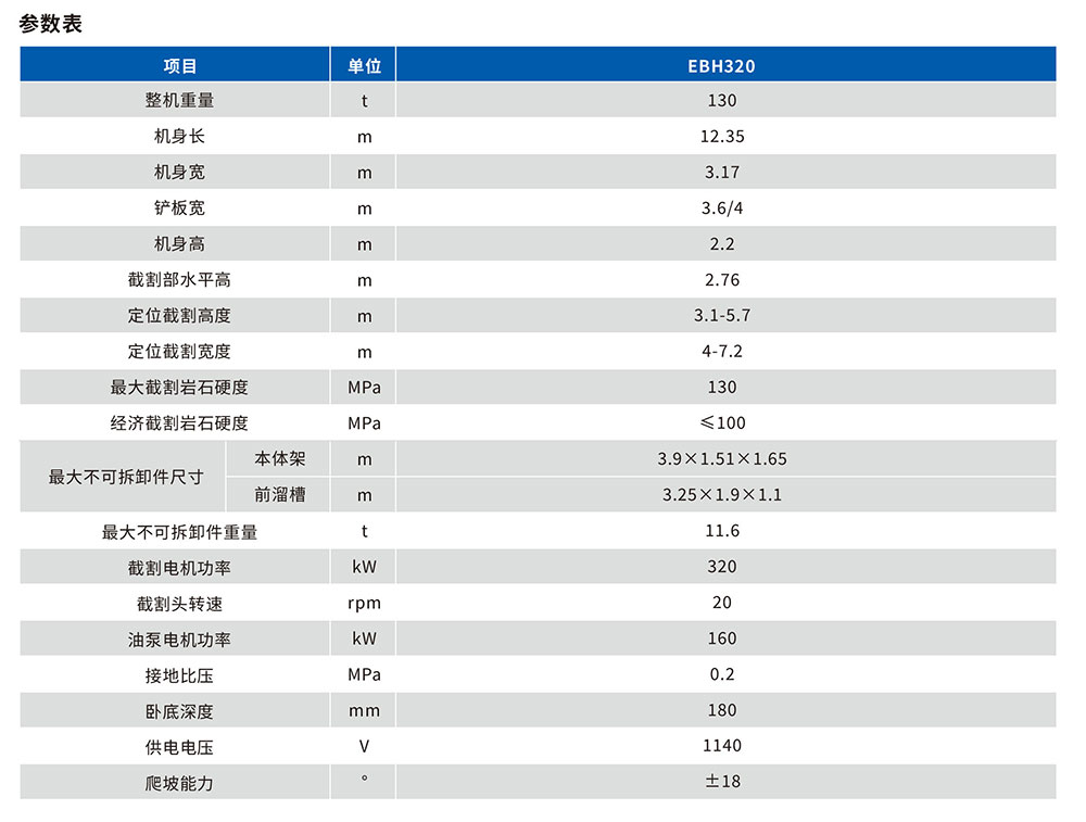 EBH320系列掘进机整机性能稳定,机身重,重心低,布局合理,用于煤岩、半煤岩开采,适用于岩石硬度F9级以下的巷道, 该系列掘进机以安全可靠、维护便捷为理念,关键零部件选用国外品牌,结构配件按标准加工、制造、检测,具有结构紧凑,操作灵活,出勤率高,服务年限长等特点,可与单轨液压四臂锚杆台车组成快掘系统,。
