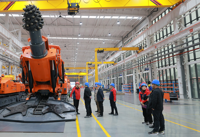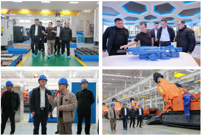 赵桂生董事长一行先后走进沃思德凿岩机专业化生产基地及鑫通智慧工厂,实地考察设备生产制造流程。在地下煤矿装备生产车间,公司生产副总刘长勇向考察团详细介绍了掘进机、掘锚机等核心装备的技术创新与远程智能控制研发成果。